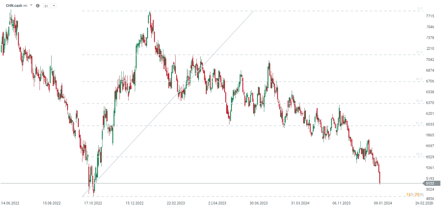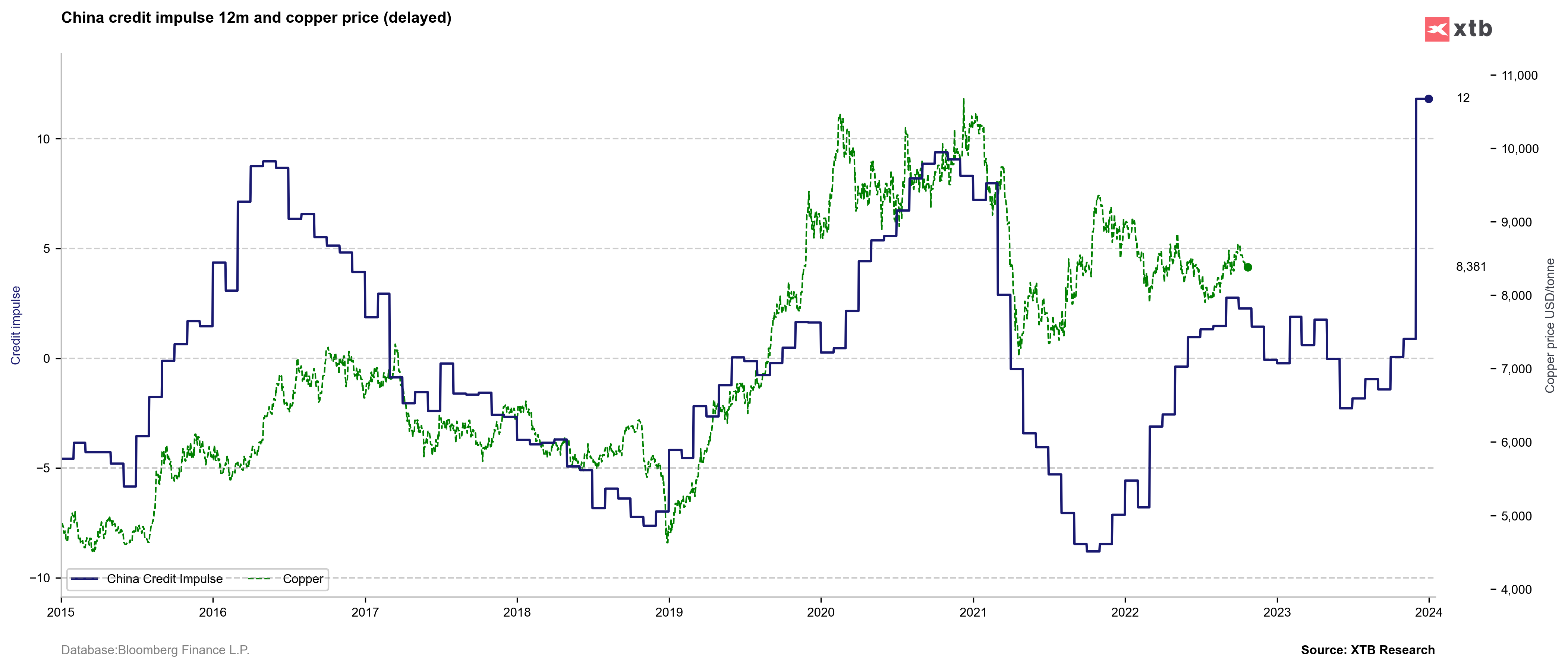 Kontrakt CHN.cash na Hand Seng Chine Enterprises (chińskich spółek notowanych w Hongkongu) traci dzisiaj 3,3%, ale od początku roku jest to strata ponad 10%. Kontrakt zbliża się do lokalnego dołka z października zeszłego roku. Warto wspomnieć, że są to poziomy bliskie najniższym w historii od 2005 roku, czyli od momentu startu indeksu. Jednocześnie pojawiła się nadzieja w Chinach na ożywienie, patrząc na wyraźny wzrost akcji kredytowej. Warto jednak pamiętać, że akcja kredytowa działa z opóźnieniem, na co może wskazywać poniższy wykres z miedzią.