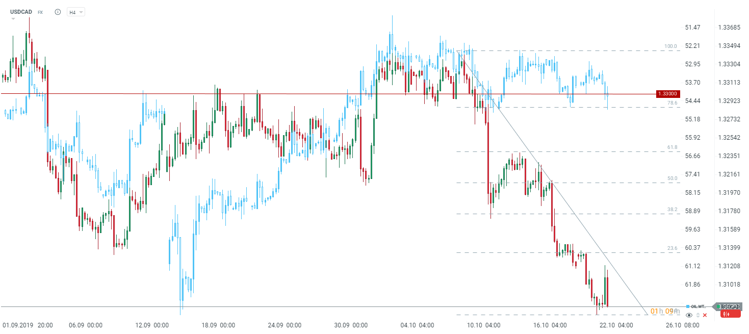 USDCAD powrócił do spadków dzięki wyraźnemu odbiciu ropy dzisiejszego dnia. Widać jednak ogromną dywergencję na krótkim interwale czasowym. Źródło: xStation5