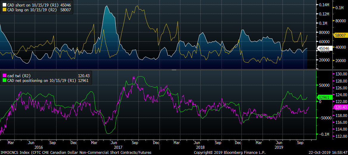 Pomimo niepewności dotyczącej tego jak ukształtuje się rząd (możliwość utworzenia koalicji, np. z partią NDP), rynek widzi szanse w dalszym umocnieniu się dolara kanadyjskiego. Indeks odwrotu ryzyka dla jednego tygodnia znajduje się najniżej przynajmniej od 10 lat, co wskazuje na wyraźny spadek ryzyka dla dolara kanadyjskiego. Dodatkowo rynek jest dosyć pozytywnie nastawiony do dolara kanadyjskiego patrząc na pozycjonowanie. Nie widać jednak wykupienia rynku, co oznacza, że nie ma raczej ryzyka powstania sygnału kontrariańskiego. Warto jednak pamiętać, że ropa naftowa wskazuje w krótkim terminie na przewartościowanie dolara kanadyjskiego. Kolejny jednak czynnik może przemawiać lekko za dalszym umocnieniem się CADa. Jest to ostatni raport BoC na temat warunków biznesowych, który pokazał poprawę sytuacji, choć wciąż podkreślał ryzyka powiązane ze światowym handlem.