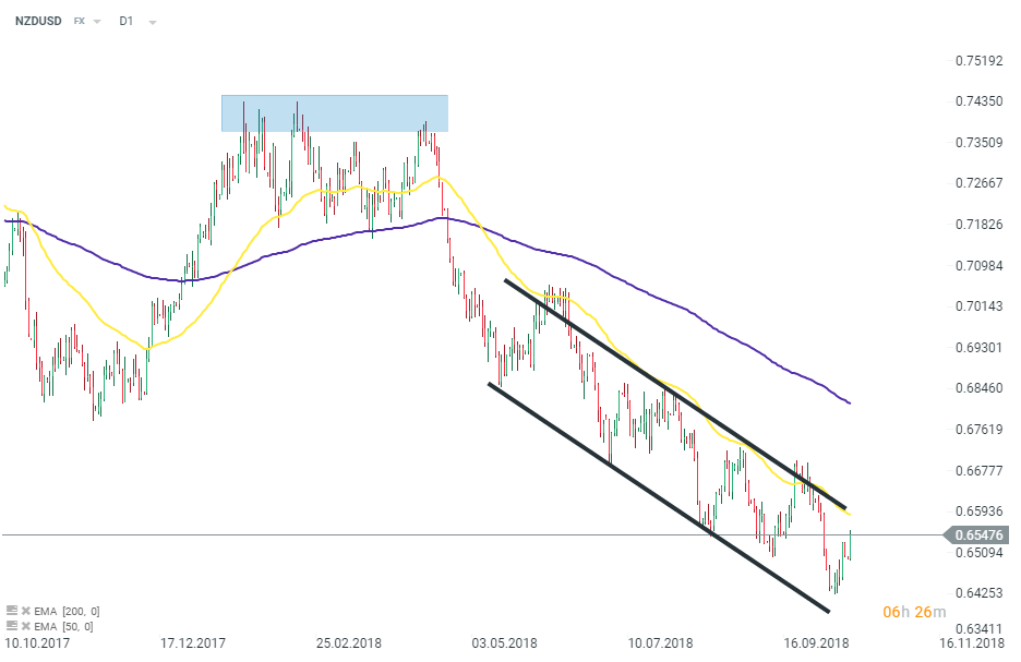Dolar nowozelandzki osłabia się systematycznie wobec dolara amerykańskiego od połowy kwietnia. Przed godziną dziewiętnastą para walutowa znajdowała się w okolicy 0,655. Źródło: xStation5.