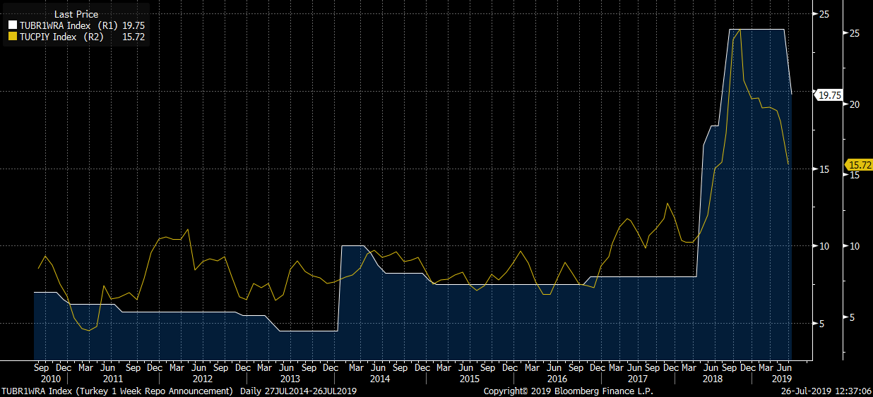 Wczoraj Turecki Bank Centralny zaskoczył lekko rynki finansowe decydując się na większą od oczekiwań obniżkę stóp procentowych. Stopy procentowe były utrzymywane od dłuższego czasu pomimo sporego spadku inflacji. Erdogan wziął jednak sprawy w swoje ręce i zdecydował się na zmianę szefa CBRT. Czy jest wobec tego zadowolony z ostatniej decyzji? Erdogan wskazuje, że wczorajsze cięcie było niewystarczające i cięcia będą kontynuowane do końca bieżącego roku. Co więcej, kontynuuje on swoje stwierdzenie, że wraz z niższymi stopami procentowymi inflacja będzie kontynuować spadki. Czy tak będzie, z pewnością przekonamy się w najbliższych miesiącach. Już teraz Goldman Sachs zapowiada, że stopy procentowe do października zostaną obniżone do poziomu 15%. Amerykański bank, podobnie jak Commerzbank uważa, że cięcia spotkają się w końcu z efektem bumeranga w postaci deprecjacji liry, co doprowadzi do odbicia inflacji.