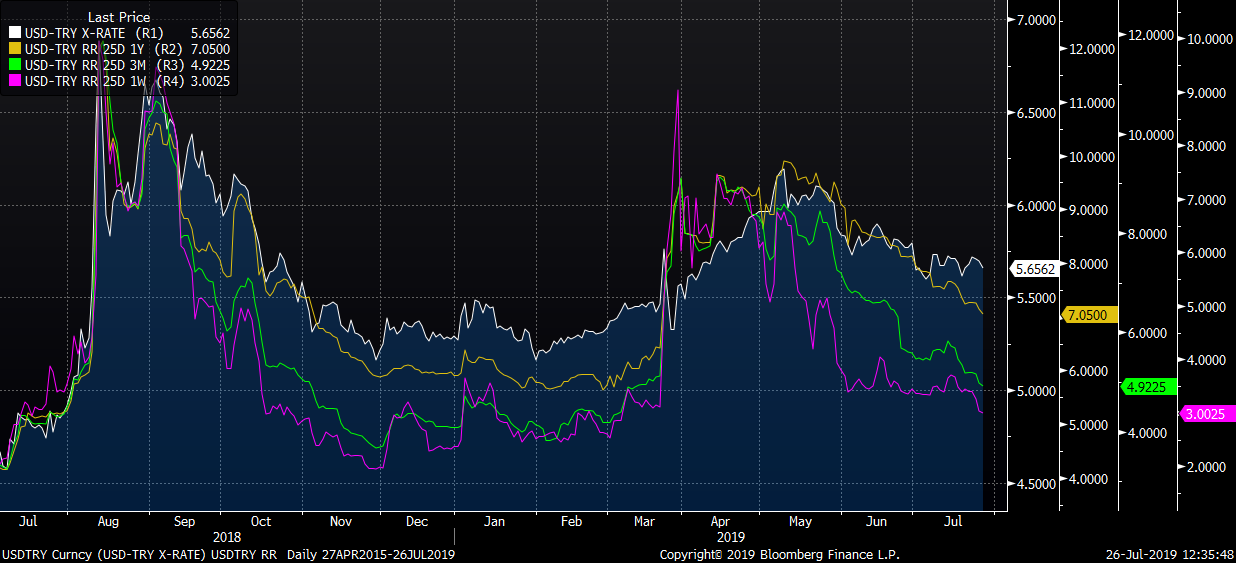 Jak widać poziom inflacji jest w dużym stopniu powiązany z kursem walutowym. Jeśli lira zacznie tracić w zestawieniu do dolara po kolejnych obniżkach ponownie będziemy świadkami kuli śniegowej i szalonej, wzmożonej deprecjacji liry. Źródło: Bloomberg