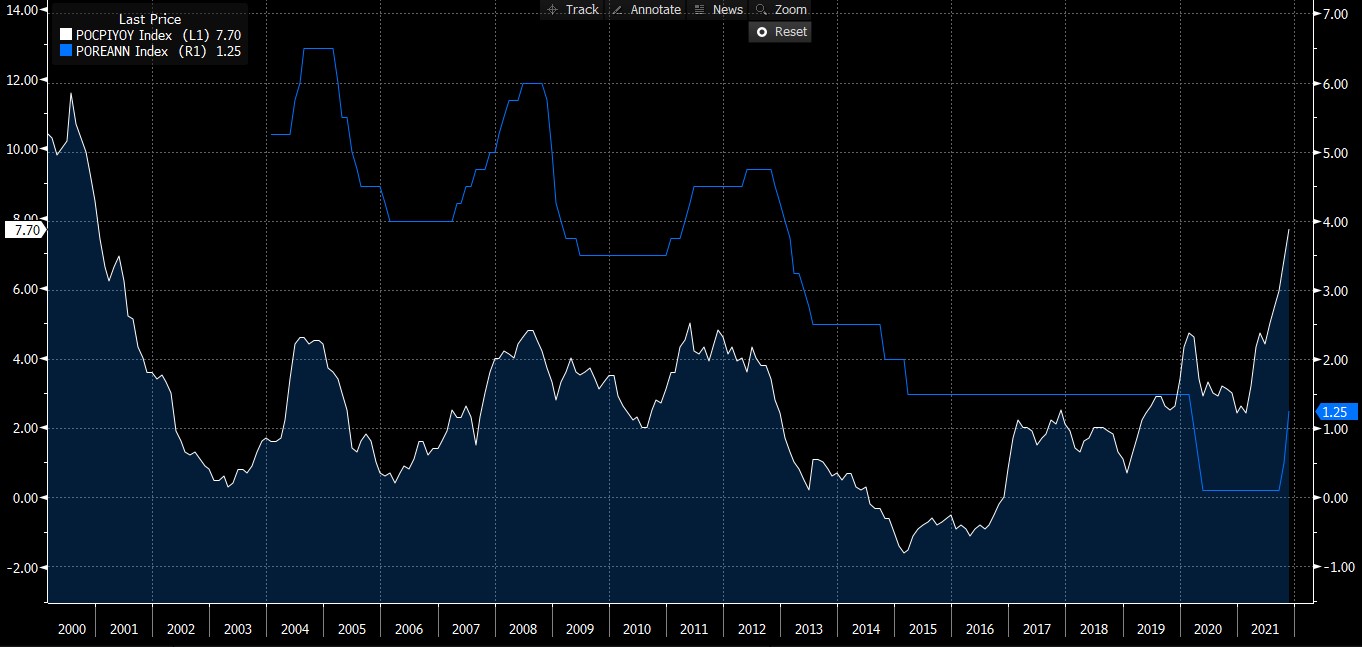 Oczekiwania banków zakładają podwyżkę o 0,5% w dniu dzisiejszym, choć niektóre prognozy mówią nawet o 0,75%. Generalnie RPP przegapił najlepszy moment do podwyżek i teraz próbuje gonić za inflacją, która oderwała się od celu (cel 2,5%, a inflacja ponad 7%). Dlatego też wydaje się mało prawdopodobne, aby dziś nie doszło do żadnej podwyżki. Wyższa niż 50 punktów bazowych podwyżka powinna być korzystna dla PLN, który umocnił się w ostatnich dniach.