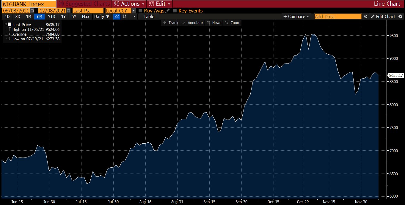 Indeks WIGBanki znajduje się od połowy marca w silnym trendzie wzrostowym. Co prawda, po utworzeniu formacji podwójnego szczytu pod koniec października, doszło do wykonania głębszej korekty, niemniej spadki wydają się wyhamowywać. Wydaje się iż wyższa niż 50 pb podwyżka może być pozytywna dla banków, z kolei niższa - negatywna.