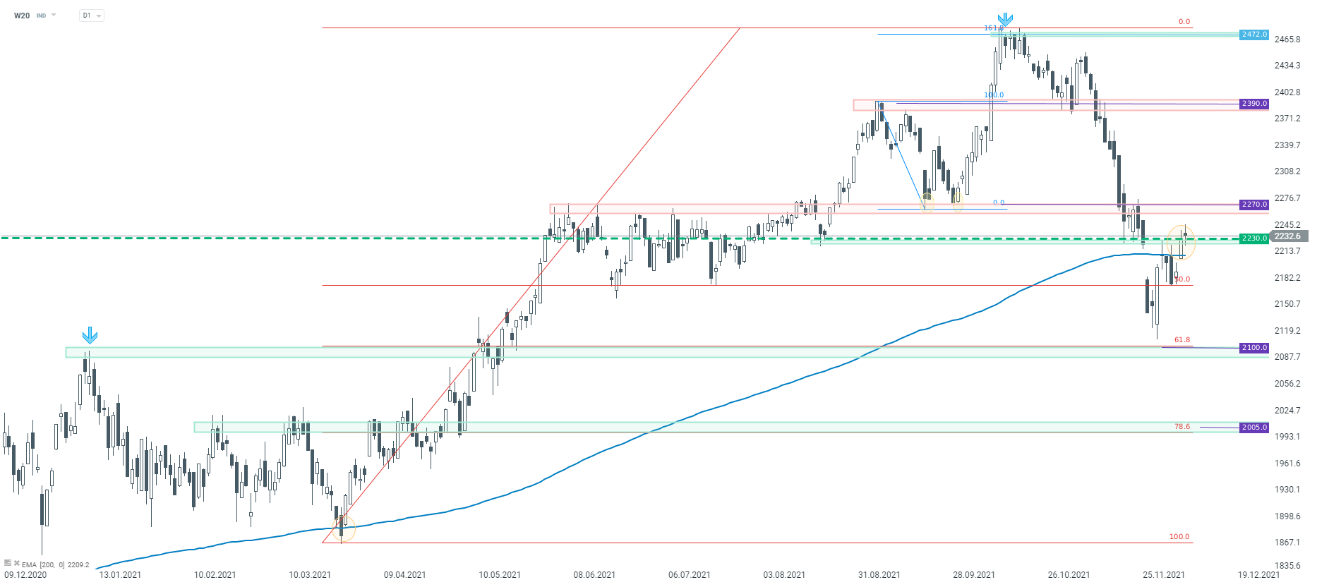 Patrząc technicznie na indeks WIG20 (W20) notowania zdołały zamknąć wczorajszą sesję powyżej strefy oporowej przy 2230 pkt, przez co istnieje szansa na ruch w kierunku kolejnego oporu przy 2270 pkt. Gdyby i ten poziom został przekroczony, ruch wzrostowy mógłby się rozszerzyć nawet w kierunku 2390 pkt. Z drugiej strony, należy zauważyć, że od połowy października dominują sprzedający, a ostatnie odreagowanie jest jak na razie niewielkie, przez co ponowne cofnięcie poniżej 2230 pkt, może przyczynić się do ponownego przejęcia inicjatywy przez sprzedających.