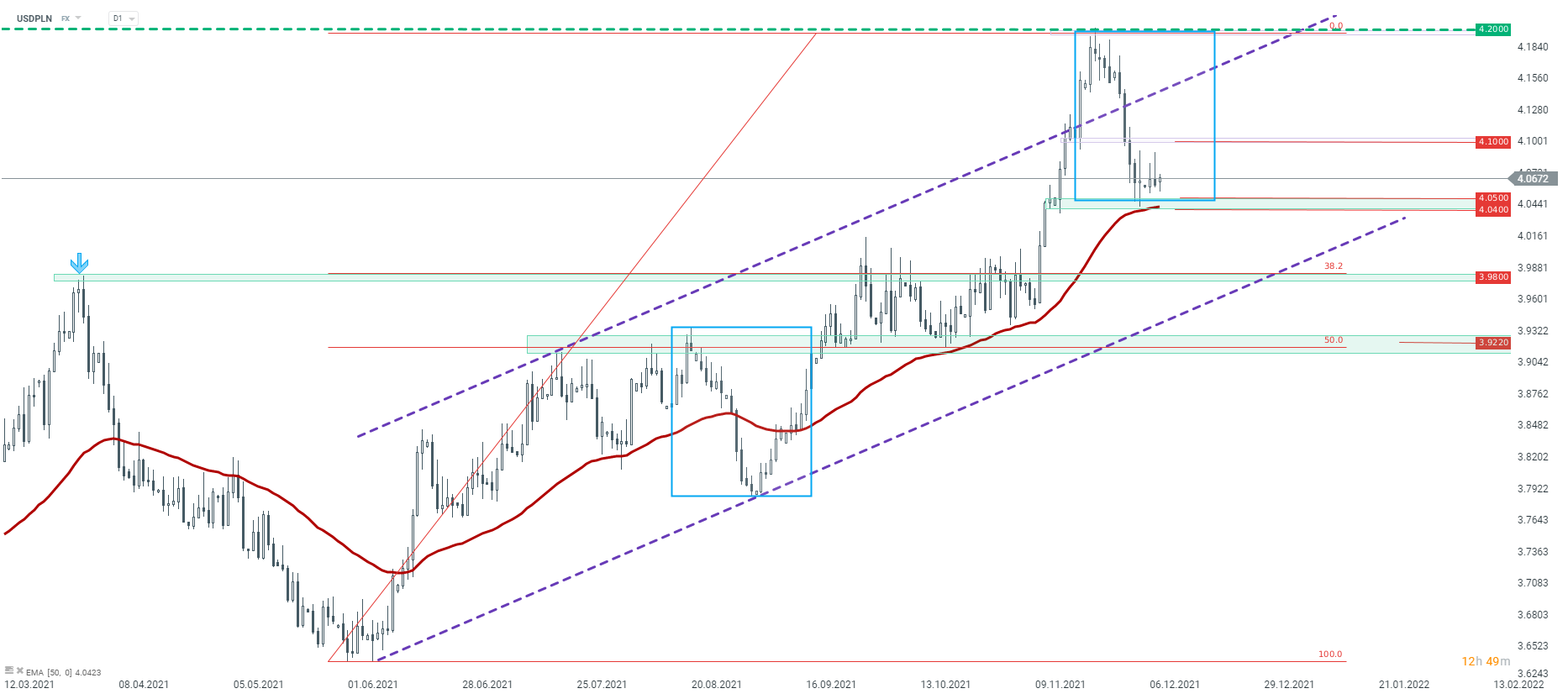 Patrząc technicznie na wykres USDPLN, mamy do czynienia z korektą w tendencji wzrostowej. mimo iż notowania wróciły do wewnątrz kanału, spadki wyhamowały na wysokości wsparcia wynikającego z dolnego ograniczenia układu 1:1 (niebieski prostokąt) oraz średniej z ostatnich 50 okresów. Strefa 4,04 -4,05 zł pozostaje więc kluczowym wsparciem w krótkim terminie. W przypadku jego złamania, spadki mógłby się pogłębić w kierunku dolnego ograniczenia wspomnianego kanału. Z kolei jako opór należy traktować okolice 4,10 zł.