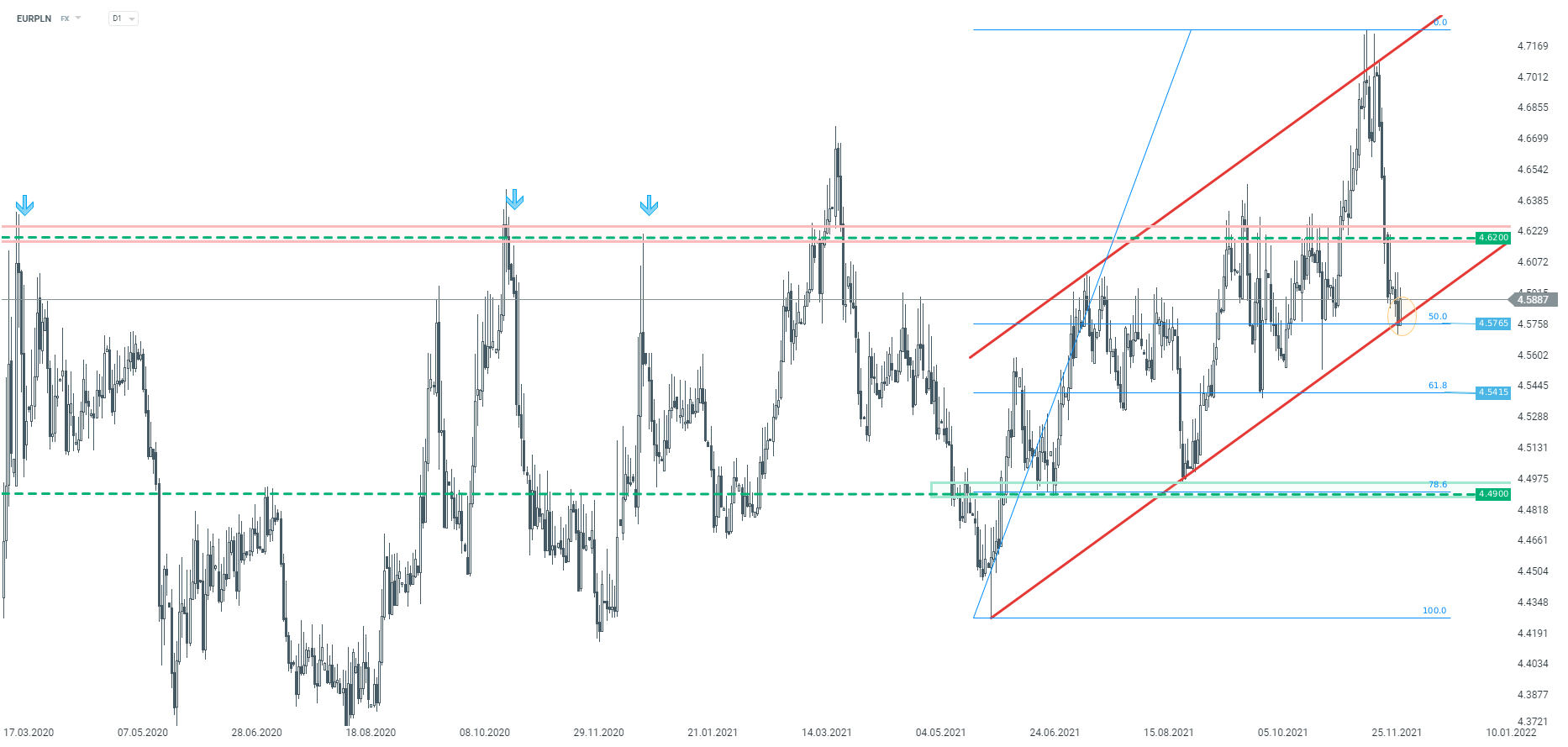 Złoty radził sobie w ostatnich dniach wyraźnie lepiej w ujęciu z euro, niż dolarem. Notowania EURPLN wróciły poniżej kluczowej strefy wsparcia przy 4,62 zł, która aktualnie powinna być traktowana jako opór. Spadki wyhamowały jednak na wysokości dolnego ograniczenia kanału wzrostowego, które pozostaje istotnym wsparciem w krótkim terminie. To, czy dojdzie w tym miejscu do odbicia, czy wybicia dołem, może nadać kierunek w krótkim terminie. W przypadku wyjścia dołem, kolejne wsparcia znajdują się odpowiednio przy 4,5414 zł i 4,49 zł. Z drugiej strony, w przypadku wzrostów wspomniana strefa przy 4,62 zł pozostaje oporem.