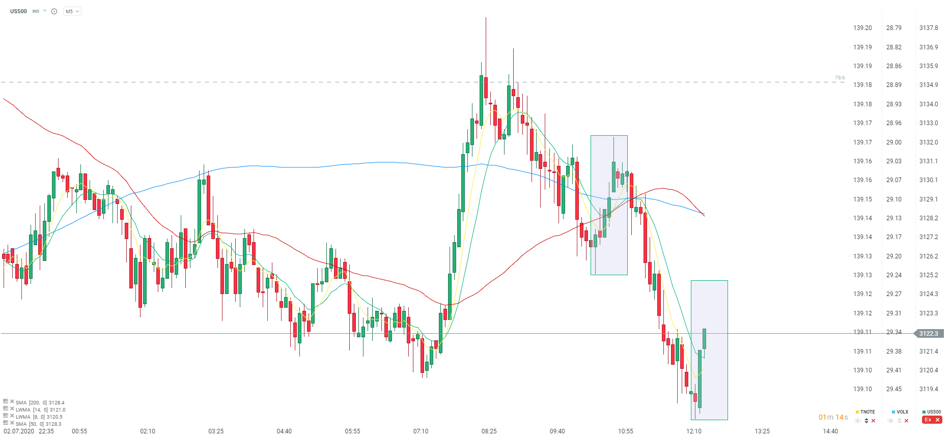 Od początku sesji europejskiej obserwujemy cofnięcie na indeksach oraz amerykańskich kontraktach. Wcześniej na kontrakcie na S&P 500 nastąpiło testowanie okolic zniesienia 78.6 całej fali spadkowej związanej z pandemią. Zniesienie to znajduje się nieznacznie poniżej kluczowego poziomu 3150 punktów. Pomimo dosyć sporego cofnięcia, kontrakt na S&P 500 znajduje się ok. 30 punktów poniżej wskazanego poziomu. Obecnie obserwujemy drugą próbę wzrostów. Opór znajduje się w okolicach poziomu 3125 punktów i wyznaczony jest przez poprzednią korektę z okolic godziny 10:00.