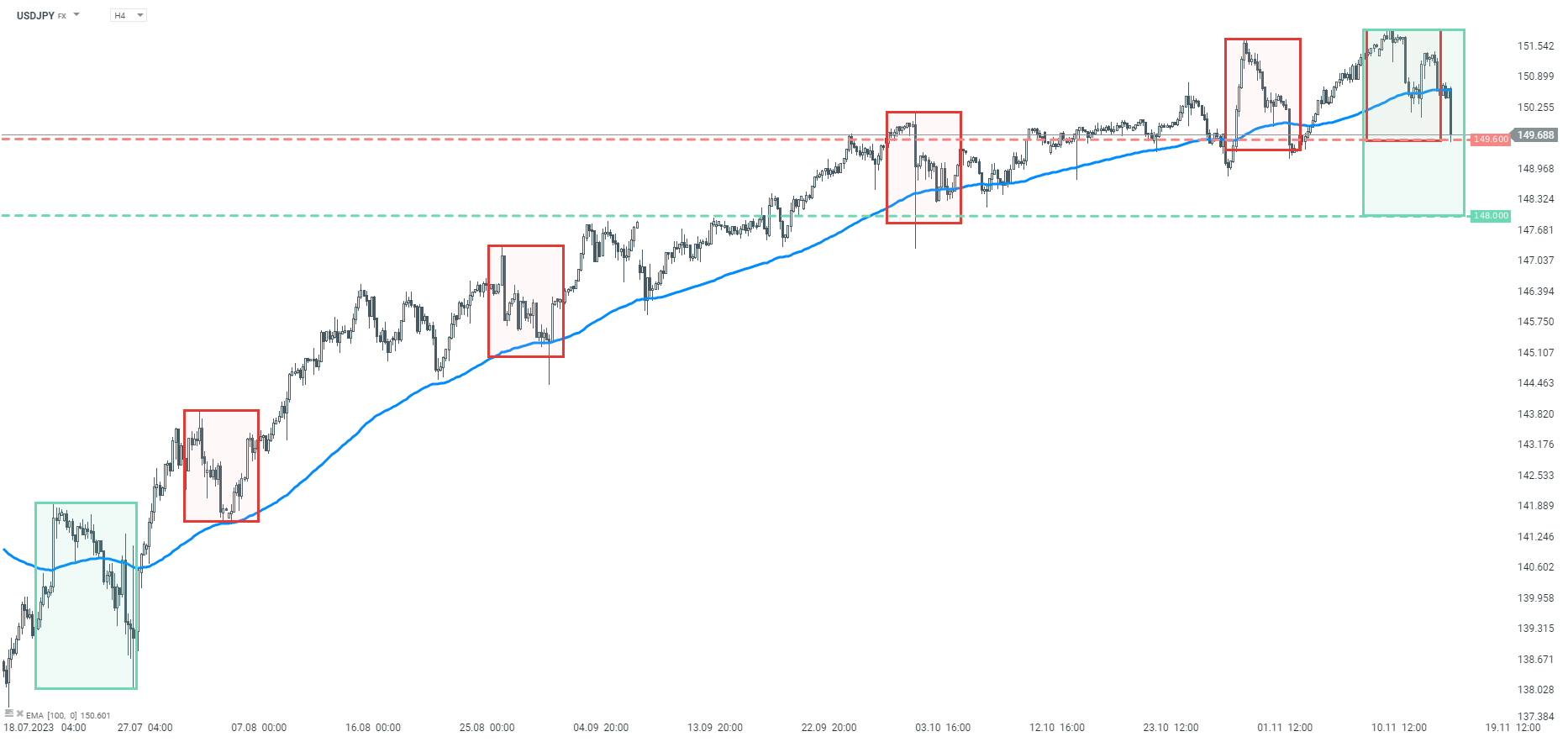 Patrząc technicznie na wykres USDJPY, od dłuższego czasu mamy do czynienia z trendem wzrostowym. Aktualnie po korekcie notowania dotarły do wsparcia przy 149,60, które wynika z dolnego ograniczenia lokalnego układu 1:1 (czerwone prostokąty). Jest to pierwsze miejsce, gdzie może uaktywnić się popyt. Jeżeli jednak poziom ten zostanie zanegowany, przecena może się przedłużyć w kierunku 148,00, gdzie wypada dolne ograniczenie szerszej geometrii 1:1. Dopiero zanegowanie większego układu mogłoby zgodnie z metodologią Overbalance doprowadzić do zmiany trendu na spadkowy.
