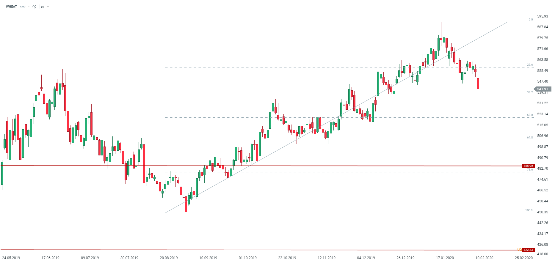 Cena pszenicy reaguje najgorzej ze wszystkich zbóż po publikacji raportu WASDE, pomimo braku dużych zmian w raporcie. Może to być jednak związane z nieznacznym obniżeniem perspektyw konsumpcyjnych, co nie daje nadziei na redukcję gigantycznych globalnych zapasów. Źródło: xStation5