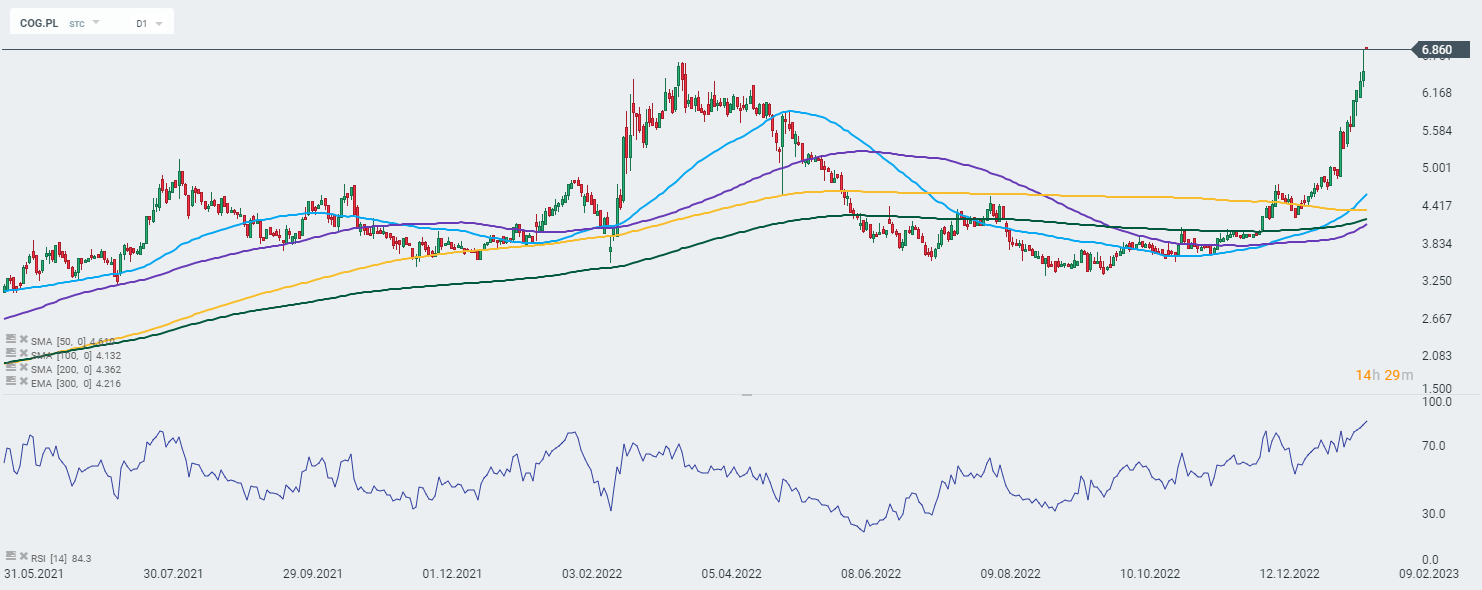 Walory spółki Cognor (COG.PL) przedłużają falę wzrostów na początku nowego tygodnia w związku ze wstępnymi wynikami finansowymi za 2022 rok. Firma szacuje, że zysk netto w za tamten rok wyniósł 602,4 mln zł, czyli o 65,7% więcej niż rok temu (363,5 mln zł). Zysk EBITDA wzrósł o 51,5% do 787 mln zł. Przychody ze sprzedaży wzrosły o 21,2%. Zysk na działalności operacyjnej spółka szacuje na 742,7 mln zł (rok temu 467,8 mln zł).