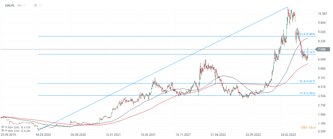 Kluczowym oporem dla Cognor (COG.PL) wydaje się obecnie poziom 8 PLN, którego pokonanie może otworzyć drogę do wyższych poziomów i przebicia się powyżej 23,6 zniesienia Fibonacciego fali wzrostowej z kwietnia 2020 roku. Źródło: xStation5