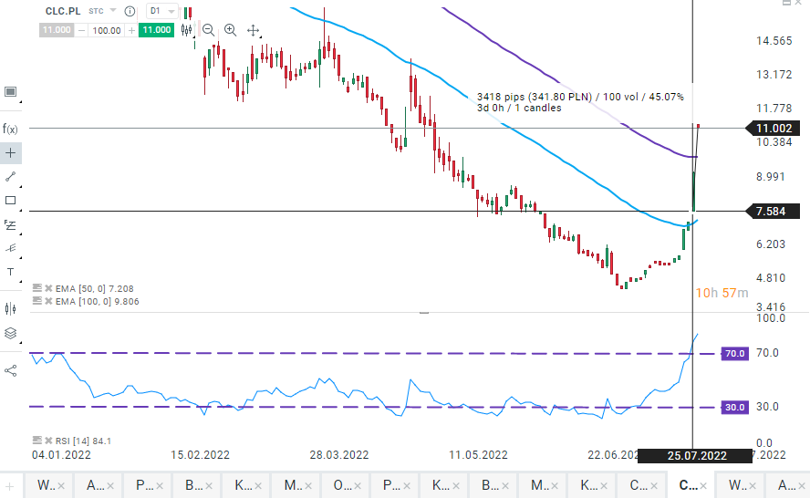 Walory Columbus Energy (CLC.PL) skaczą dzisiaj o ponad 20% i wybijają się powyżej wspomnianej w piątek 100- dniowej, wykładniczej średniej kroczącej (fioletowa krzywa). Źródło: xStation 5