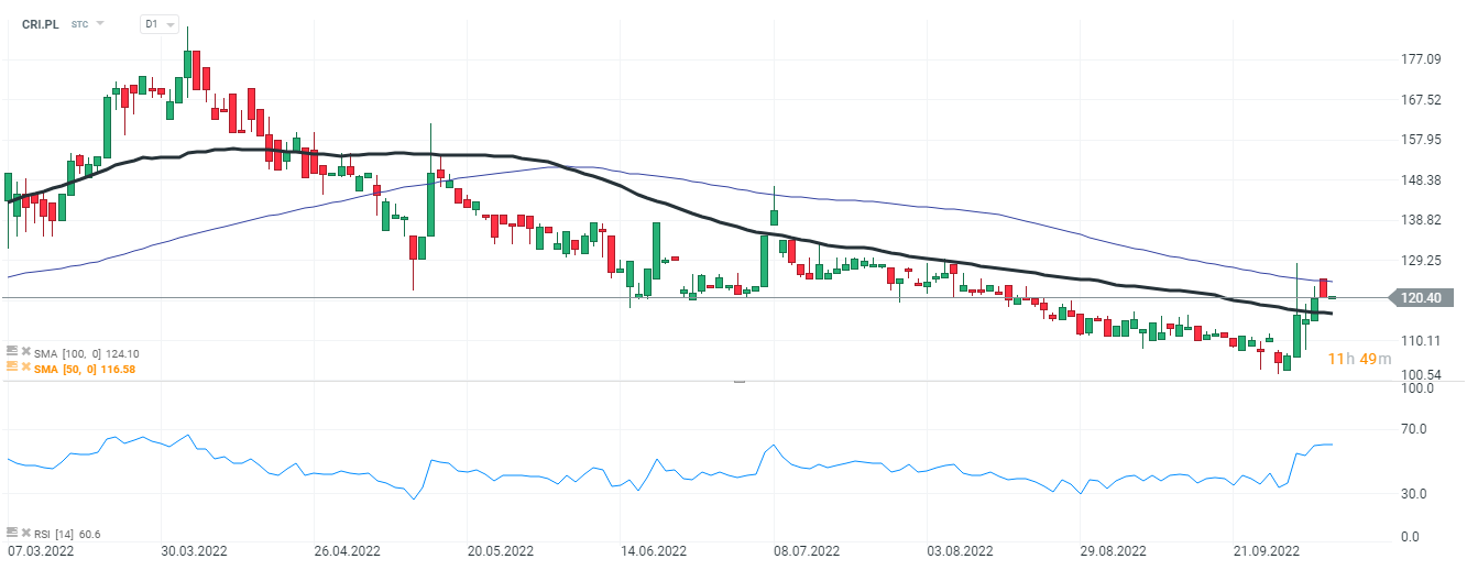 Akcje Creotech (CRI.PL), interwał D1. Kurs walorów Creotechu znajduje się w trendzie spadkowym, notowania wspięły się jednak powyżej 50 sesyjnej średniej SMA50, która wyznaczała dla opór od początku lipca. Na poziomach średniej SMA100, w okolicach 124 PLN za akcję pojawił się pierwszy znaczący opór i obecnie cena znajduje się pomiędzy dwiema średnimi.Źródło: xStation5