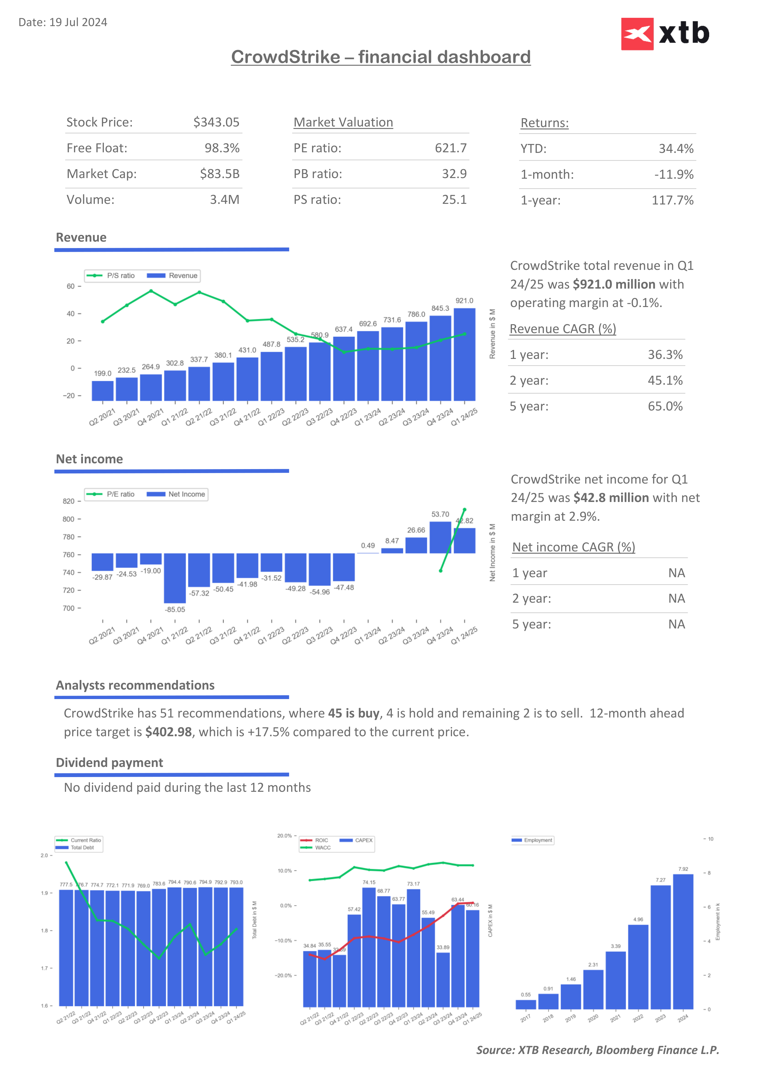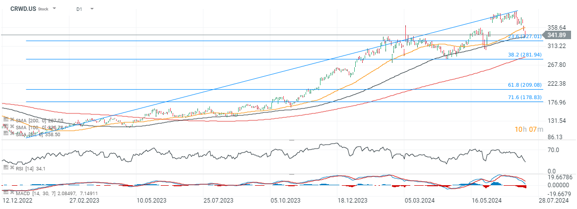 Piątkowa aktualizacja oprogramowania przez notowanego na Nasdaq giganta cyberbezpieczeństwa, CrowdStrike (CRWD.US), mogła spowodować globalną awarię systemów IT i chaos w sektorze finansowym i lotniczym. Rynek akcji zareagował odpowiednio, sprzedając akcje CrowdStrke ze względu na potencjalne straty marketingowe i wciąż możliwe ryzyko roszczeń. Wczoraj analitycy Redburn Atlantic obniżyli cenę docelową akcji Crowdstrike do 275 USD za akcję, z 380 USD wcześniej.