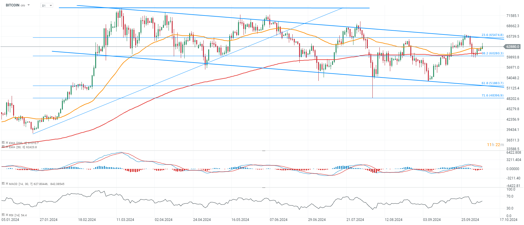 Bitcoin notowany jest powyżej 63 tys. USD i zyskuje niespełna 1%, próbując przebić się powyżej górnego ograniczenia średnioterminowego kanału wzrostowego, co potencjalnie implikowałoby odwrócenie spadkowego trendu. Sentyment wśród pozostałych kryptowalut pozostaje wciąż mieszany, a 'altcoiny' pozostają w cieniu BTC. Najlepiej w ujęciu dziennym radzą sobie dziś Graph, Filecoin i Uniswap.