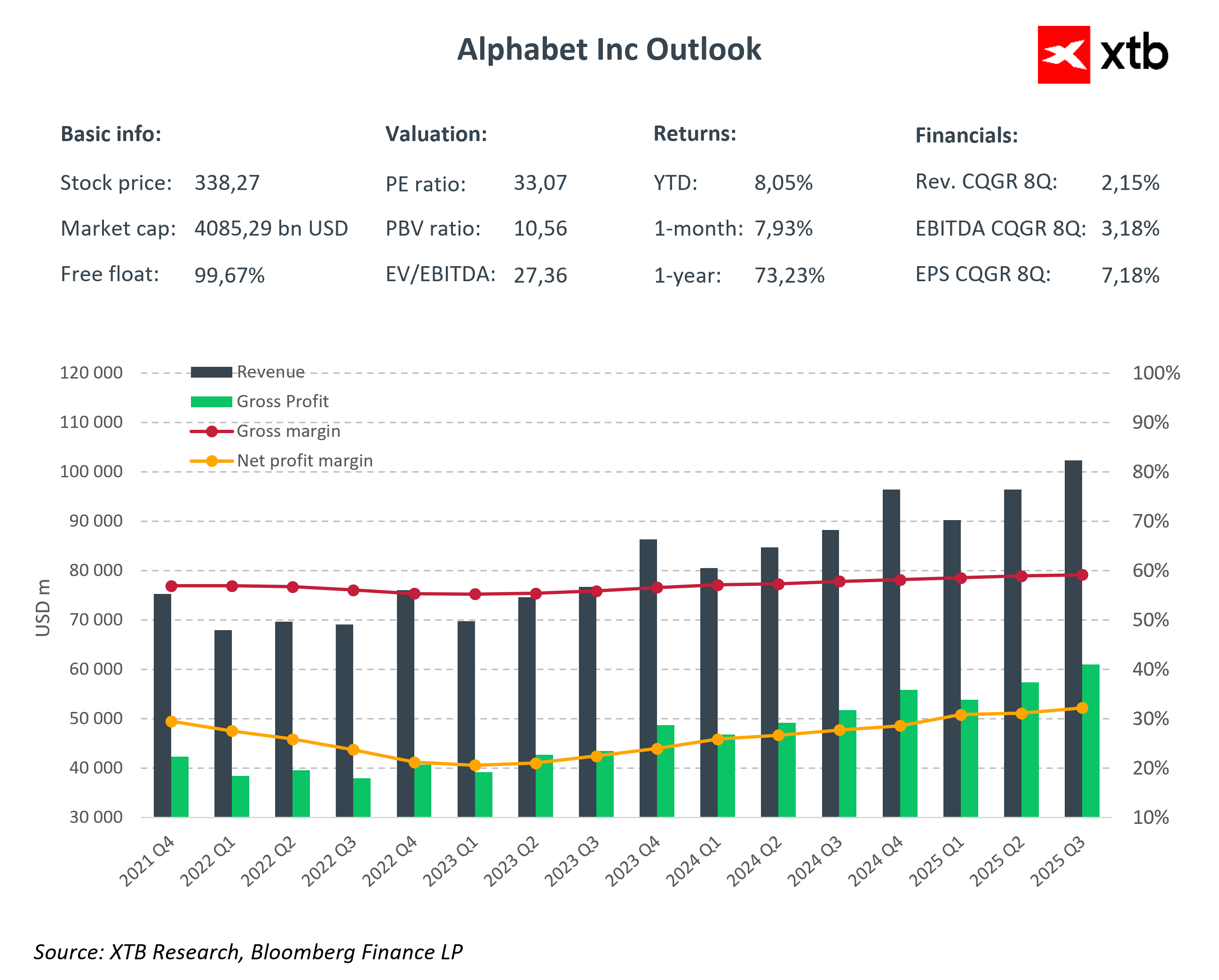 Alphabet intensywnie inwestuje w AI oraz centra danych. Wysokie wydatki powodują presję na marże operacyjne mimo solidnego wzrostu przychodów.