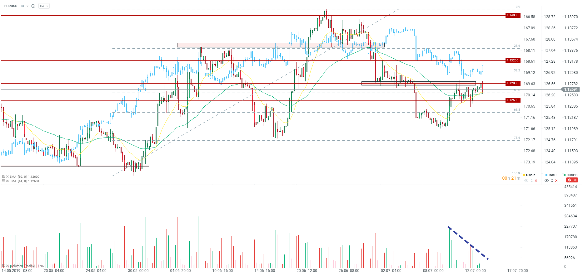 EURUSD notowany jest w tym momencie w krótkoterminowej konsolidacji pomiędzy poziomem 1,1250 oraz 1,1280. Dodatkowo para wspierana jest poprzez dwie średnie ruchome oraz linię trendu wzrostowego. W przypadku ponownego spadku rentowności w USA, para powinna kontynuować odbicie. Małym problemem może okazać się spadek wolumenu. Sugeruje on zmęczenie się aktualnym trendem. Jeśli na obecnej świecy spadkowej będziemy mieli wybicie wolumenowe, może to oznaczać przejęcie inicjatywy przez niedźwiedzie. Źródło: xStation5