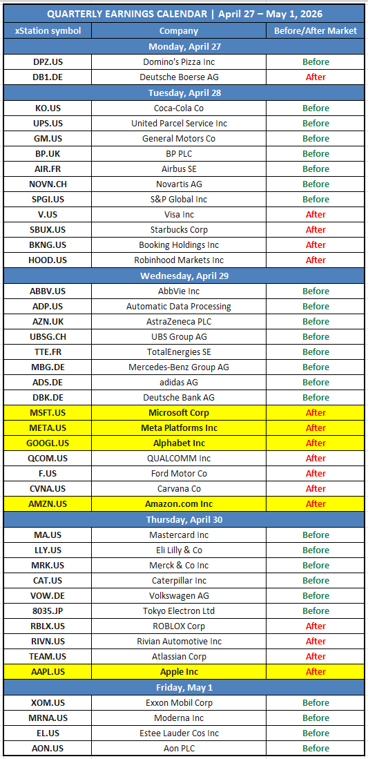 • Kluczowy tydzień makro i korporacyjny: Fed (środa), ECB i BoE (czwartek), BoJ, BoC. Dane: US PCE, GDP, ISM Manufacturing PMI. Pięć spółek z „Mag 7" raportuje wyniki – każde rozczarowanie przy obecnych wycenach może wywołać gwałtowną korektę z historycznych szczytów.