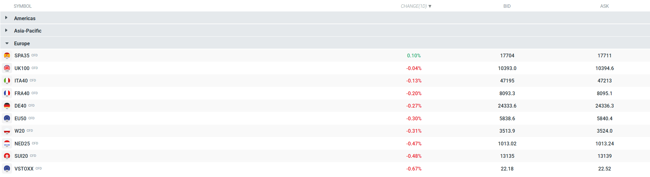 Notowania europejskich kontraktów w chwili obecnej. Źródło: xStation