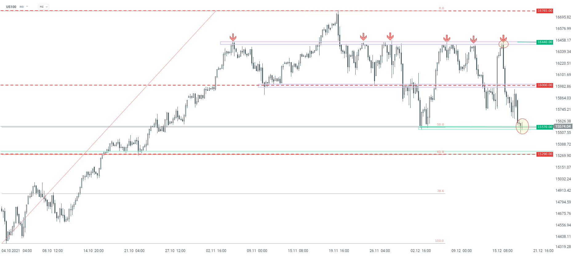 Patrząc na sytuację techniczną na US100, notowania dotarły do wsparcia przy 15 570 pkt. Miejsce to wynika z dołków z początku grudnia i mierzenia 50% całej fali wzrostowej która rozpoczęła się w październiku. Jeżeli poziom ten zostanie przekroczony, niewykluczone, że przecena przyspieszy w kierunku kolejnego wsparcia przy 15 290 pkt.