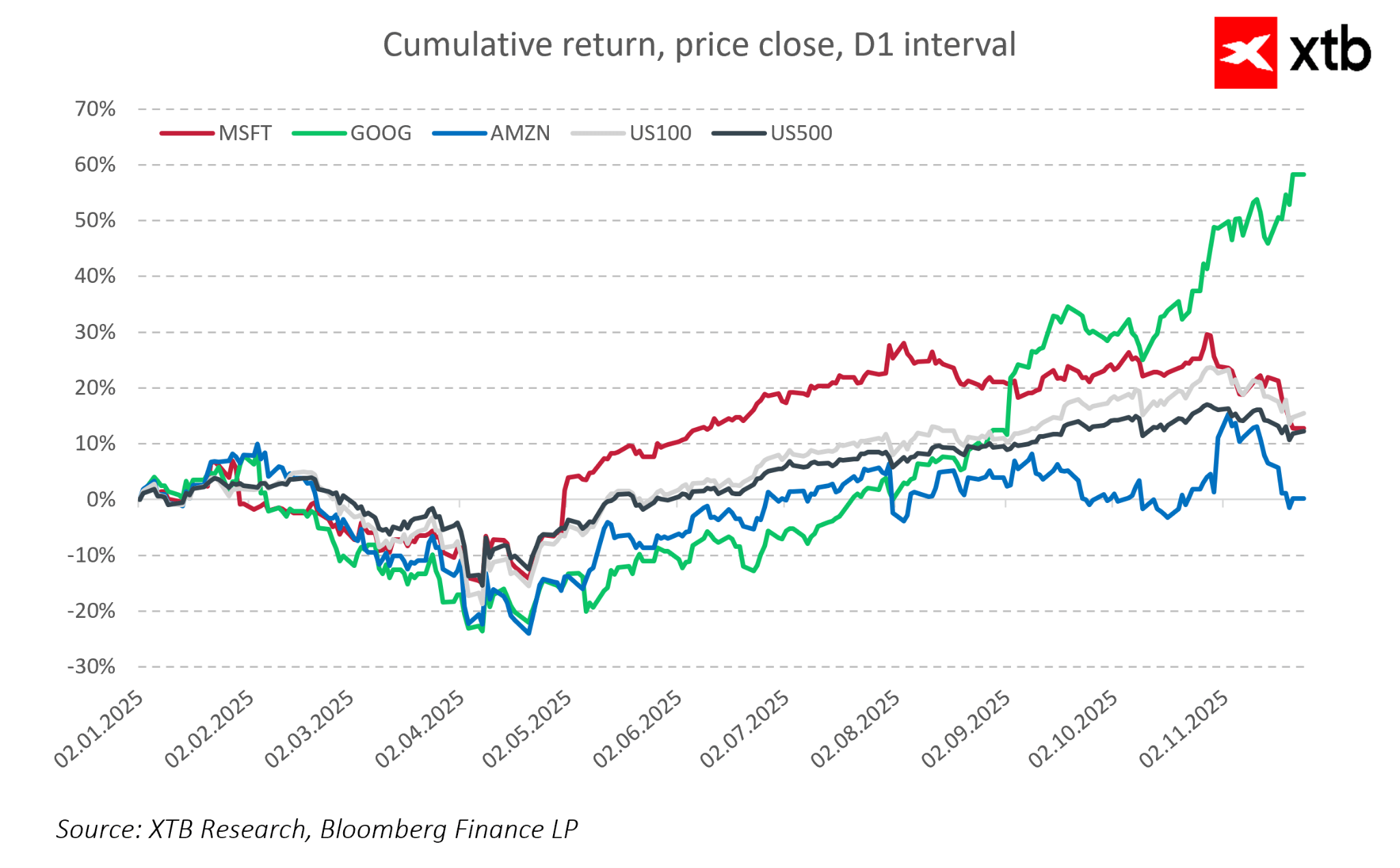 W Skrócie, Gemini 3 znacząco wzmacnia pozycję Alphabetu jako kluczowego gracza w obszarze sztucznej inteligencji, a możliwość trenowania modelu na własnych procesorach TPU daje firmie strategiczną przewagę kosztową, technologiczną i operacyjną. Obecnie trudno jednak jednoznacznie stwierdzić, że Alphabet osiągnął pełną dominację w rywalizacji o AI. Sukces technologiczny i rynkowy jest wyraźny i stanowi mocny fundament dla dalszego rozwoju, ale przyszłość nadal niesie ze sobą ryzyka i zmienne wyzwania, które będą determinować ostateczną pozycję firmy na rynku. Warto podkreślić, że stopa zwrotu akcji Alphabet od początku roku znacząco przewyższa zarówno konkurentów takich jak Microsoft i Amazon, jak również główne indeksy giełdowe, w tym S&P 500 i Nasdaq 100, co odzwierciedla rosnące zaufanie inwestorów do strategicznej pozycji firmy w obszarze sztucznej inteligencji.