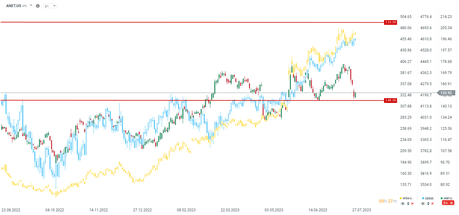 Warto zwrócić uwagę, że ok. połowa przychodów spółki pochodzi z zamówień takich gigantów jak Microsoft oraz Meta, które po części pokazały dobre wyniki finansowe, a zaskoczyły pozytywnie przede wszystkim w kontekście dalszego rozwoju technologii związanych ze sztuczną inteligencją, co powinno być pozytywne w dłuższej perspektywie dla ANET.US.