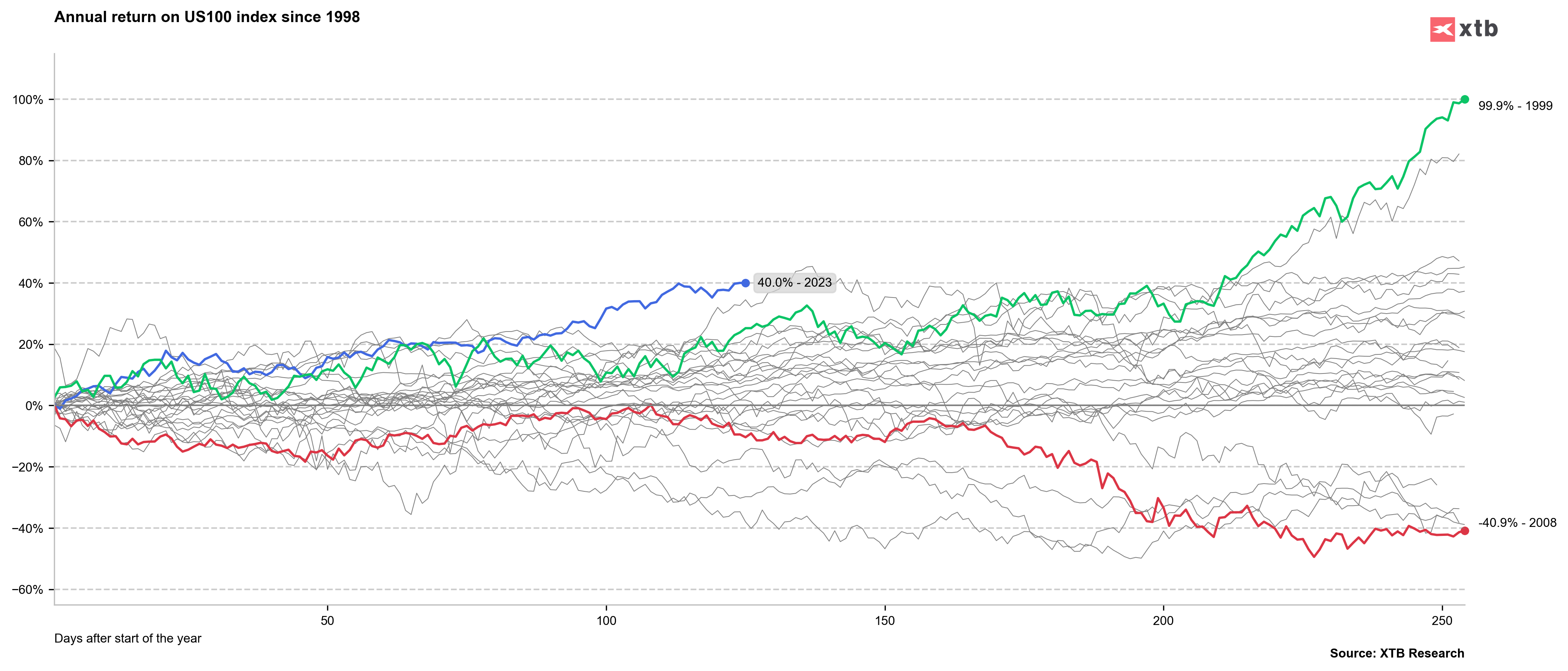 Pierwsza połowa tego roku była rekordowa pod względem stóp zwrotu na Nasdaq 100 (US100) na tle historycznych lat. Indeks spółek technologicznych zaliczył solidny 40% wzrost. Gdyby obecny rok miał się zakończyć z taką stopą zwrotu, to uplasowałby się on w pierwszej 5 lat z najlepszą stopą zwrotu i to w otoczeniu tak wysokich stóp procentowych. Źródło: Bloomberg, XTB