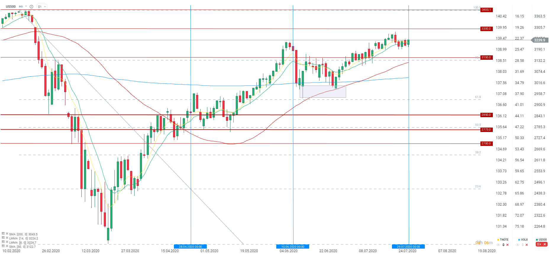 Po ogłoszeniu decyzji podczas poprzedniego spotkania FED obserwowaliśmy największą korektę w obecnym trendzie wzrostowym, który rozpoczął się w okolicach połowy marca. Dodatkowo warto zauważyć, że już 2 dzień po spotkaniu kwietniowym również miała miejsce korekta. Widać, że brak dodatkowych kroków przez Fed był odbierany przez rynki raczej mieszanie. Jak będzie teraz? Odpowiedź dostaniemy w przeciągu najbliższych kilkunastu godzin.