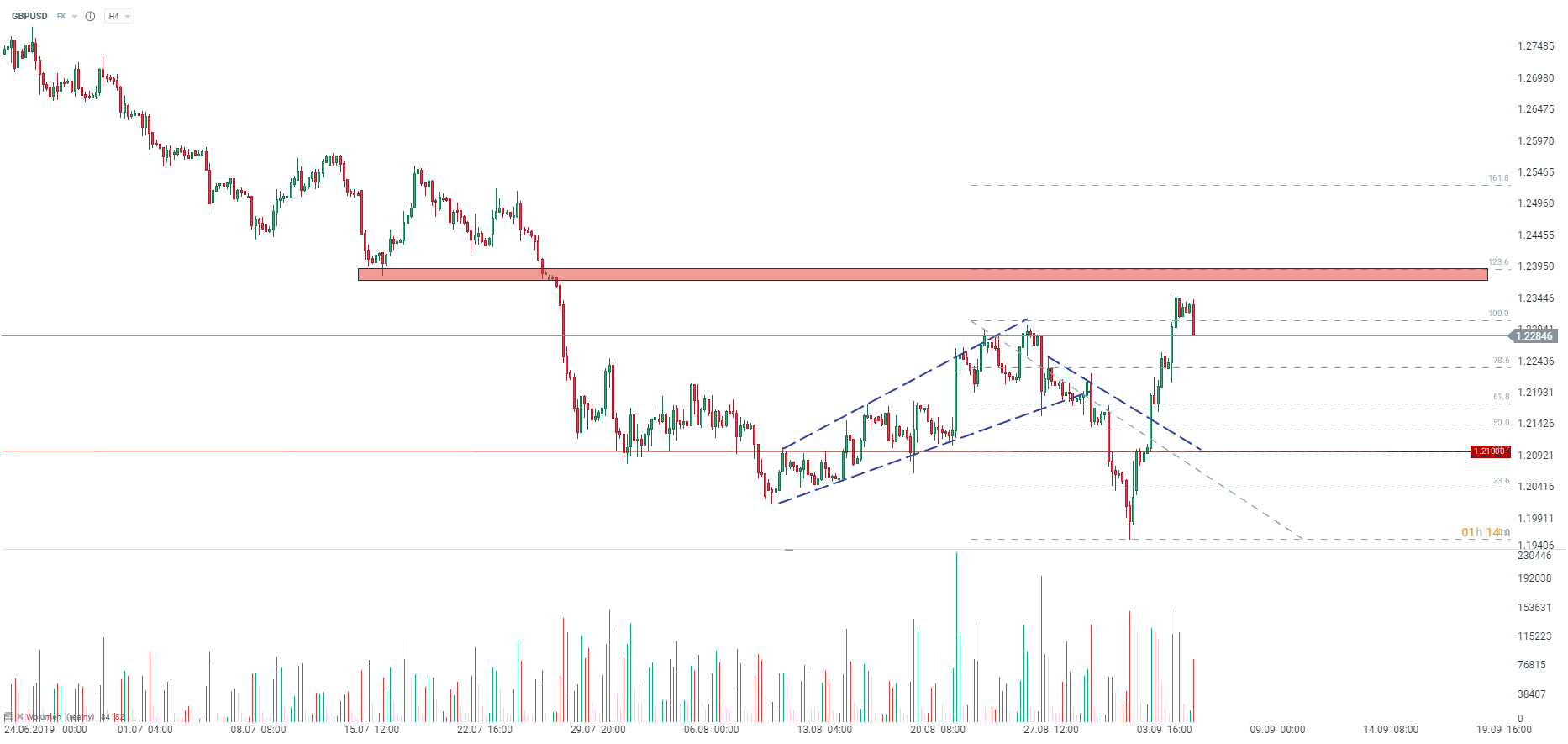 GBPUSD cofa się z okolic poziomu 1,2300. Najbliższe wżniejsze wsparcie to dopiero okolice zniesinia 78.6. Źródło: xStation5