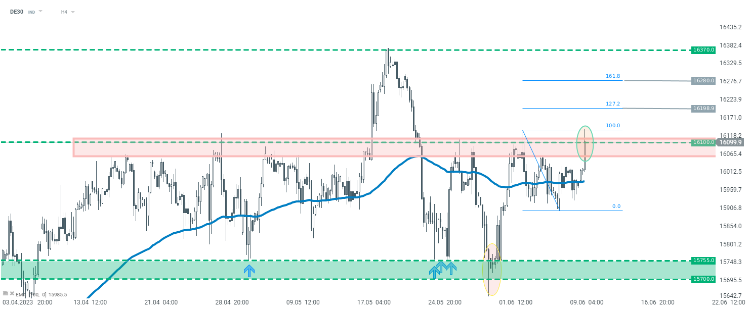 Dzisiejsza sesja na niemieckim indeksie giełdowym rozpoczęła się od wzrostów. Patrząc technicznie na kontrakt oparty o DAX (DE30), kurs od pewnego czasu poruszał się w konsolidacji pomiędzy wsparciem w rejonach 15700, pkt, a oporem przy 16100 pkt. Niemniej dziś notowania dotarły do górnego ograniczenia ruchu bocznego, co daje kolejną szansę na wybicie w górę. Biorąc pod uwagę długoterminowy trend wzrostowy, wydaje się, że prawdopodobieństwo takiego scenariusza jest większe niż zmiany trendu na spadkowy. W przypadku takiego ruchu, celem dla kupujących może stać się ostatnie maksimum przy 16370 pkt. Wcześniej należy jednak zwrócić uwagę na opory wynikające z mierzeń zewnętrznych Fibonacciego 127,2% i 161,8%. Niemniej należy zauważyć, że dopóki wspomniana wcześniej strefa nie zostanie wybita, niewykluczone jest cofnięcie z oporu przy 16100 pkt i dalsza konsolidacja.