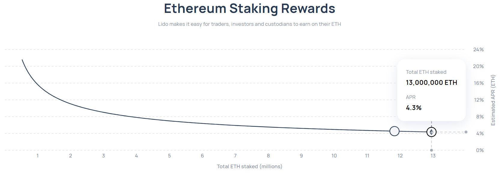 Ilość stakowanych tokenów ETH w Lido rośnie i wynosi obecnie ponad 13 milionów. Jednocześnie wraz ze wzrostem stakowanych ETH spada wartość nagród dla walidatorów, blokujących w sieci swoje tokeny celem umożliwienia płynności w sieci. Źródło: Lido