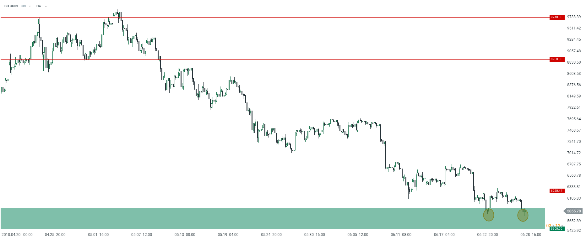 Czy to kolejna próba poderwania Bitcoina? Mamy do czynienia z możliwym podwójnym dołkiem, wciąż powyżej 5500 USD. Źródło: xStation5