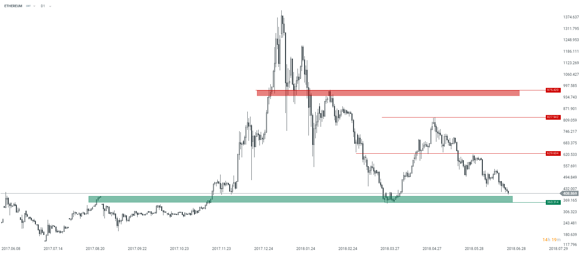 Patrząc na Ethereum obserwujemy wyraźną falę spadkową postępującą od ostatnich dwóch miesięcy. Niemniej porównując tę kryptowalutę do innych można stwierdzić, że Ethereum zachowywało się najlepiej spośród wszystkich innych. Podczas gdy większość najważniejszych kryptowalut takich jak Litecoin, Ripple, Dash oraz nawet Bitcoin spadły poniżej lokalnych dołków z przełomu marca oraz kwietnia, to Ethereum znadjuje się jeszcze wyraźnie powyżej tych dołków. Wobec tego można spodziewać się, że Ethereum może być pierwszą kryptowalutą, która zacznie odbijać od swojego kluczowego poziomu oporu.