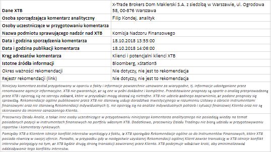 Ta publikacja handlowa jest informacyjna i edukacyjna. Nie jest rekomendacją inwestycyjną ani informacją rekomendującą lub sugerującą strategię inwestycyjną. W materiale nie sugerujemy żadnej strategii inwestycyjnej ani nie świadczymy usługi doradztwa inwestycyjnego. Materiał nie uwzględnia indywidualnej sytuacji finansowej, potrzeb i celów inwestycyjnych klienta. Nie jest też ofertą sprzedaży ani subskrypcji. Nie jest zaproszeniem do nabycia, reklamą ani promocją jakichkolwiek instrumentów finansowych. Publikację handlową przygotowaliśmy starannie i obiektywnie. Przedstawiamy stan faktyczny znany autorom w chwili tworzenia dokumentu. Nie umieszczamy w nim żadnych elementów oceniających. Informacje i badania oparte na historycznych danych lub wynikach oraz prognozy nie stanowią pewnego wskaźnika na przyszłość. Nie odpowiadamy za Twoje działania lub zaniechania, zwłaszcza za to, że zdecydujesz się nabyć lub zbyć instrumenty finansowe na podstawie informacji z tej publikacji handlowej. Nie odpowiadamy też za szkody, które mogą wynikać z bezpośredniego czy też pośredniego wykorzystania tych informacji. Inwestowanie jest ryzykowne. Inwestuj odpowiedzialnie.