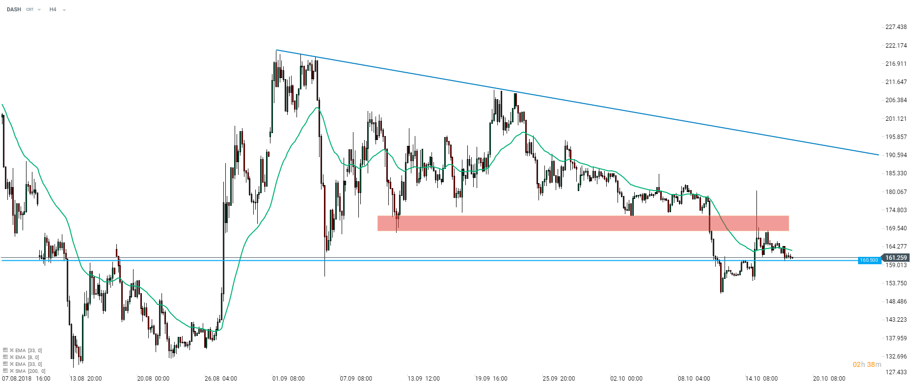 Cena DASH cofnęła się po nieudanej próbie naruszenia strefy oporu. Kryptowaluta notowana jest nieco powyżej poziomu 160,50 USD. Warto zauważyć, że cena kilkukrotnie reagowała na ten poziom w ostatnich miesiącach. Źródło: xStation5