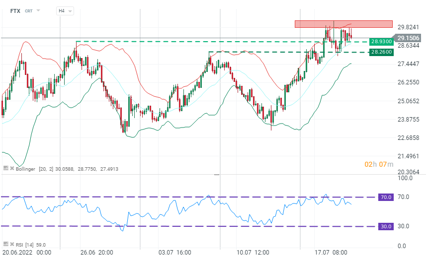 Wykres projektu FTX, interwał H4. Z technicznego punktu widzenia kryptowaluta znajduje się obecnie w strefie konsolidacji po ostatnim impulsie wzrostowym. Nastroje byków zostały dzisiaj nieco przyćmione w strefie 30 dolarów, gdzie zarysowała się wyraźna strefa podaży. Za lokalne wsparcie możemy obecnie uznać rejony 28,93 dolarów oraz 28,26 dolarów. Źródło: xStation 5