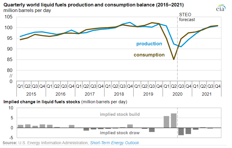 Teoretycznie rynek ropy powinien być zbilansowany od końca obecnego roku. Z drugiej strony druga fala koronawirusa może naciskać na kartel, aby ten utrzymał większe cięcia produkcji. Źródło: EIA