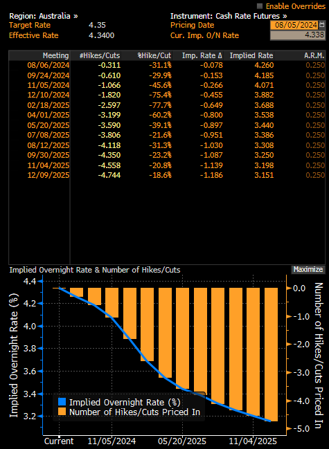 Rynek wycenia pierwszą obniżkę dopiero w listopadzie. Niemniej biorąc pod uwagę globalne zawirowania, nie można wykluczyć tego, że moment pierwszej obniżki przesunie się na wrzesień. Jeśli padłyby takie sugestie ze strony Bullock, wtedy AUD może znaleźć się pod mocniejszą presją sprzedających, choć w tym momencie obserwujemy mocne cofnięcie na AUDUSD. Źródło: Bloomberg Finance LP, XTB