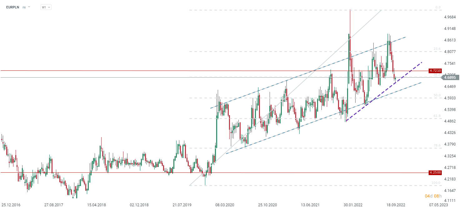 EURPLN znalazł się na najniższych poziomach od sierpnia teg roku, zaliczając spadek poniżej poziomu 4,70. W oczekiwaniu na decyzję RPP doszło do lekkiego osłabienia złotego, ale przy 4,7200 znajduje się dosyć silny opór. Jednocześnie para utrzymuje lokalną linię trendu i teoretycznie może być nastawiona na przełamanie jej i spadki do zakresu 4,65 w okolice dolnego ograniczenia wzrostowego kanału trendowego. Do tego trzeba będzie podwyżki lub mocnego obniżenia projekcji inflacyjnych. Jeśli ziści się najgorszy scenariusz, czyli brak podwyżki oraz znaczne podniesienie projekcji inflacyjnej, EURPLN może szybko ponownie znaleźć się w okolicach poziomów 4,75-4,80. Źródło: xStation5