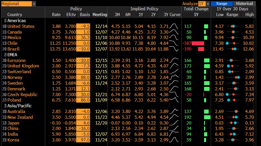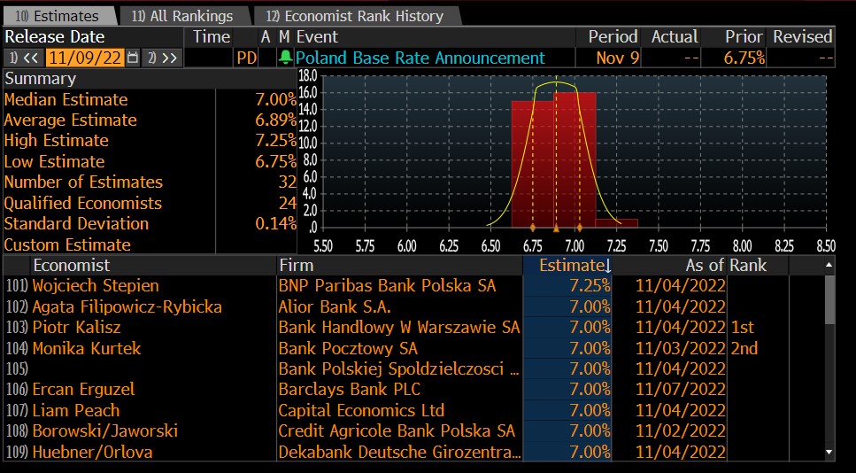 Bloomberg wskazuje, że obecnie konsensus wskazuje na 25 punktów bazowych podwyżki. 16 ekonomistów wskazuje na podwyżkę właśnie o ten poziom, jeden widzi szanse na 50 pb, natomiast 15 wskazuje na brak podwyżek. W październiku w trakcie konferencji prasowej, prof. Adam Glapiński sugerował, że podwyżki mogły się już zakończyć, choć oficjalnie Rada Polityki Pieniężnej zdecydowała się jedynie na pauzę. Szef NBP i RPP wskazywał jednak, że musiałoby dojść do dużego wzrostu inflacji (prawdopodobnie powyżej 20%), aby doszło do kolejnej podwyżki. Warto zwrócić uwagę, że wiele banków centralnych dokonało tzw. pivotu w polityce monetarnej, czyli zmianie nastawienia. Dzieje się to w postaci zmiany komunikacji, zmniejszenia podwyżek czy nawet zatrzymania podwyżek – tak jak dzieje się to np. w Czechach, czy również na Węgrzech. Z drugiej strony Fed wskazuje, że podwyżki będą kontynuowane, choć prawdopodobnie w nieco mniejszym tempie od grudnia.