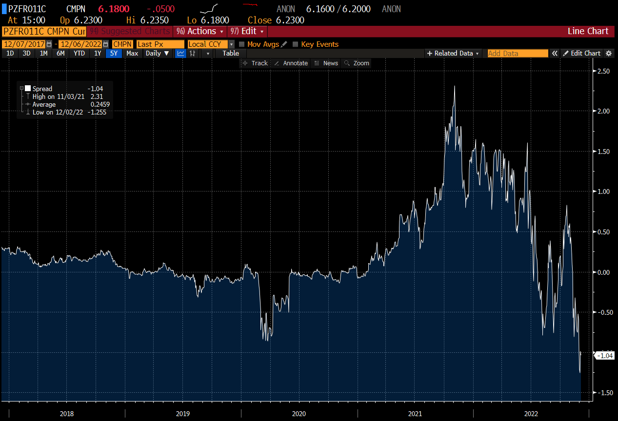 Wydaje się jednak, że sam rynek podchodzi do tego zbyt optymistycznie. W przyszłym roku musielibyśmy zauważyć ponad 100 punktów bazowych obniżki! Z drugiej strony rynek stopy procentowej dosyć dobrze wycenił mocne podwyżki, które zmaterializowały się na przestrzeni ostatniego roku.