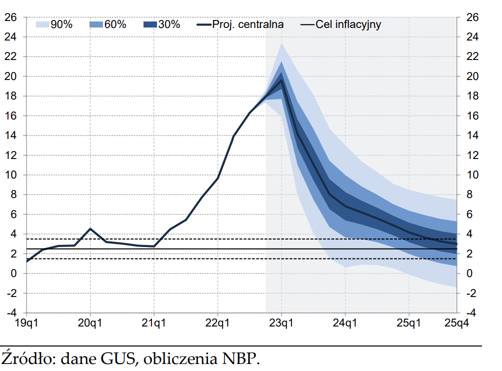 Ostatnia projekcja inflacyjna dawałaby szanse na jednocyfrową inflację z końcem przyszłego roku. Warto jednak pamiętać, że projekcja zakłada szczyt inflacyjny bliski 20% w I kwartale przyszłego roku. Źródło: NBP