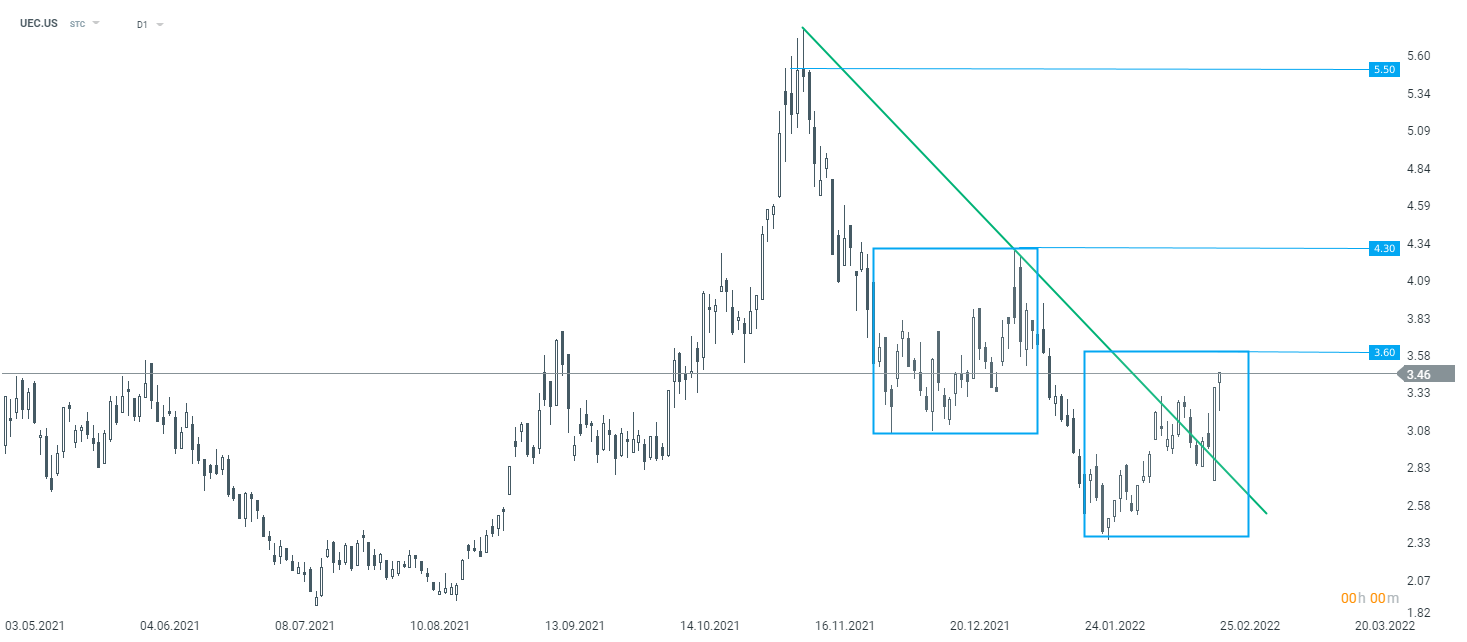 Z technicznego punktu widzenia, kurs UEC.US zdołał przebić się powyżej linii trendu spadkowego i zbliża się do górnego ograniczenia struktury 1:1 na poziomie 3,6 USD. Jeśli dojdzie do przebicia wyżej, ruch wzrostowy może przyspieszyć w kierunku 4,30 USD Źródło: xStation5