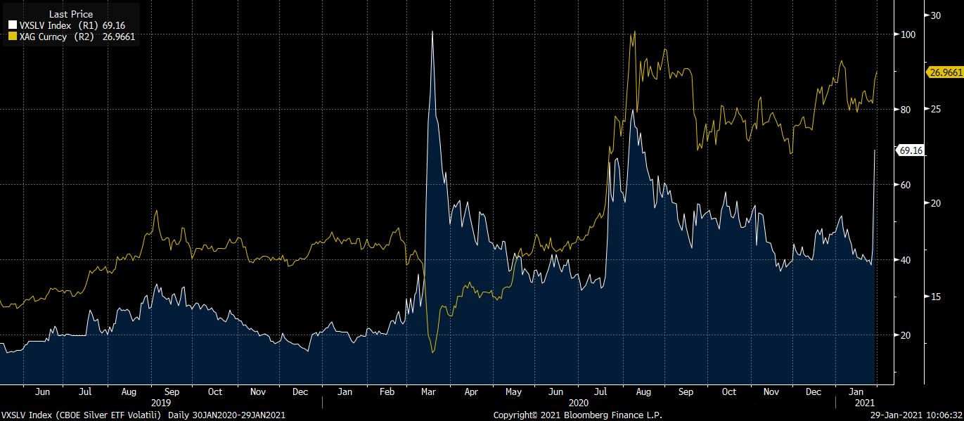 ETFy i kupowanie srebra fizycznego czy w kontraktach to jednak nie wszystko. Jest jeszcze rynek opcji, który pokazuje, jak potencjalnie duże ruchy mogą mieć miejsce. Indeks zmienności na rynku srebra (bazujący na opcjach na fundusze ETD) podskoczył wczoraj z ok. 40% do 69%. Z kolei indeks reverse ratio, który pokazuje różnicę w cenach opcji call i put OTM dla perspektywy jednego miesiąca wzrósł do historycznych szczytów w okolice 17 punktów. To pokazuje, że duża inwestorzy dopiero budują swoją pozycję na ostateczny atak na rynku srebra.