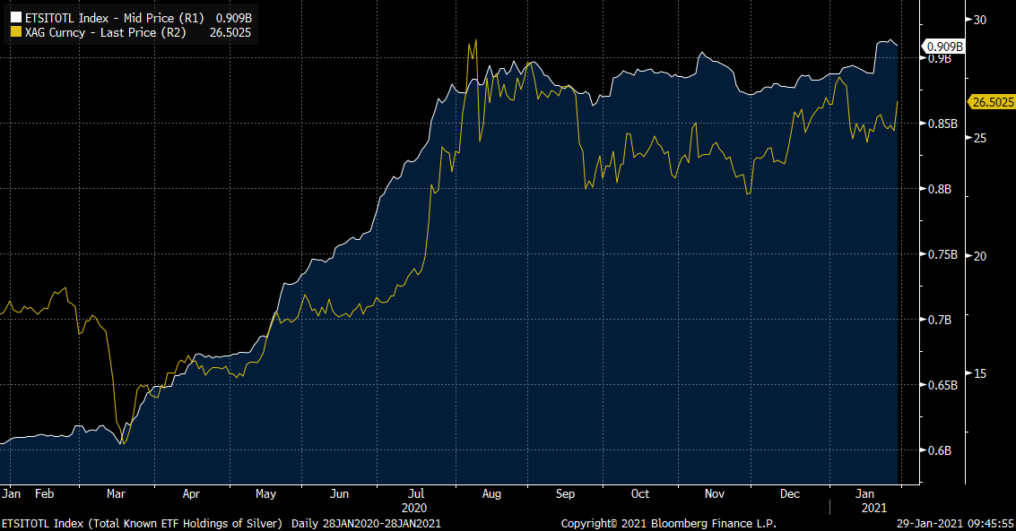 ETFy są w posiadaniu 900 mln uncji srebra. Źródło: Bloomberg