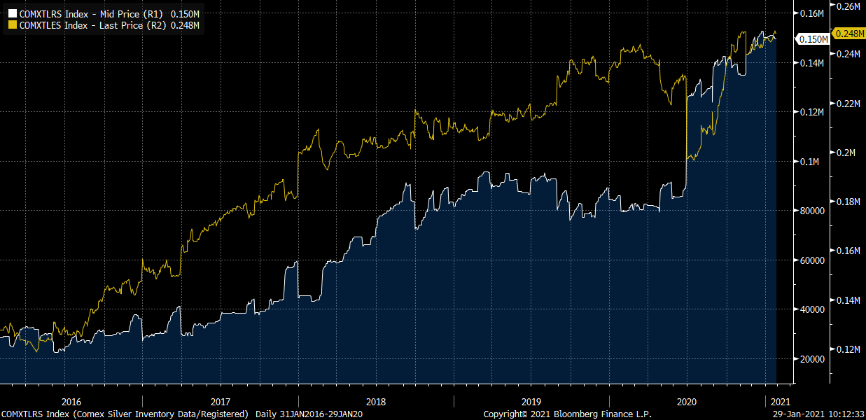 Zapasy srebra na COMEX. Źródło: Bloomberg