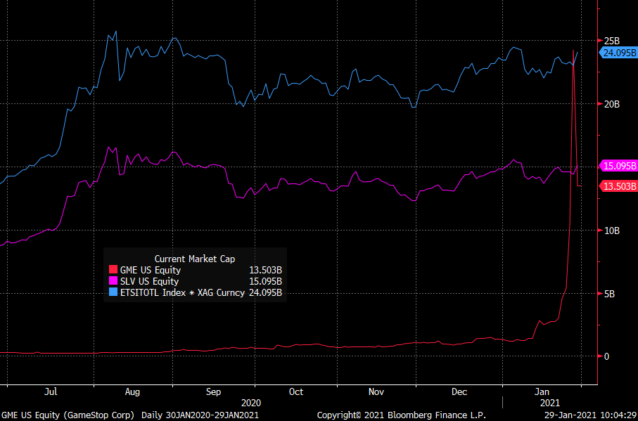 Kapitalizacja rynkowa Gamestop sięgnęła niemal 25 mld dolarów. Obecnie kapitalizacja srebra w posiadaniu wszystkich funduszy ETF na srebro to nieco ponad 24 mld dolarów. Kapitalizacja funduszu SLV.US, który stoi na celowniku inwestorów z Reddita to 15 mld dolarów. Widać wobec tego, że nie jest to rynek, którego nie da się ruszyć. Źródło: Bloomberg