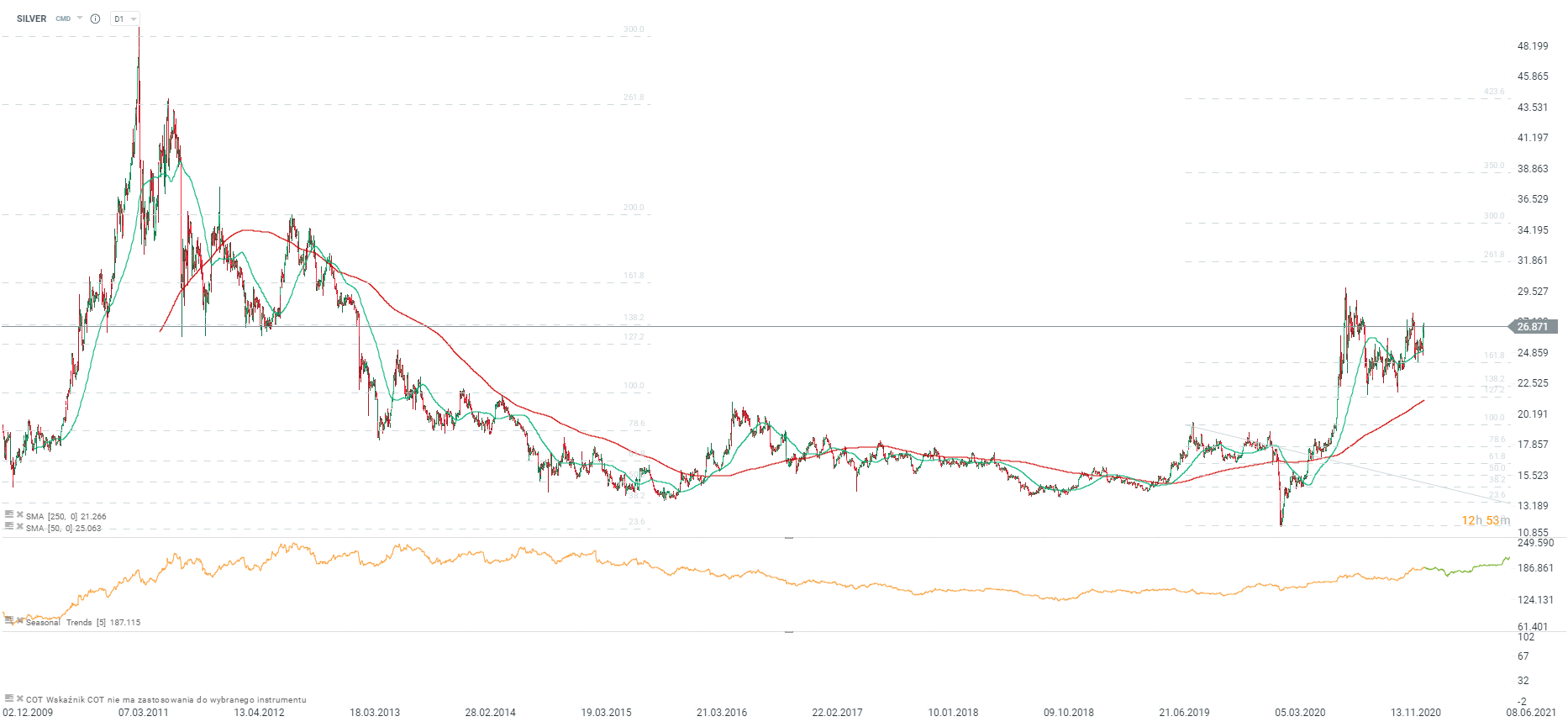 Jak widać srebro odbija się wyraźnie od 50 okresowej średniej i przymierza się do testowania silnej strefy podażowej wyznaczonej przez zeszłoroczne maksima. Za srebrem stoją mocne fundamenty oraz status aktywa zabezpieczającego przed możliwie rosnącą inflacją w tym roku. Wciąż perspektywy cenowe wyglądają podobnie, jak było to w latach 2008-2011. Warto jednak pamiętać, że ewentualny rajd detalistów na srebro może być wykorzystany przez większych uczestników rynku, którzy będą chcieli potencjalnie zarabiać na spadkach. Źródło: xStation5