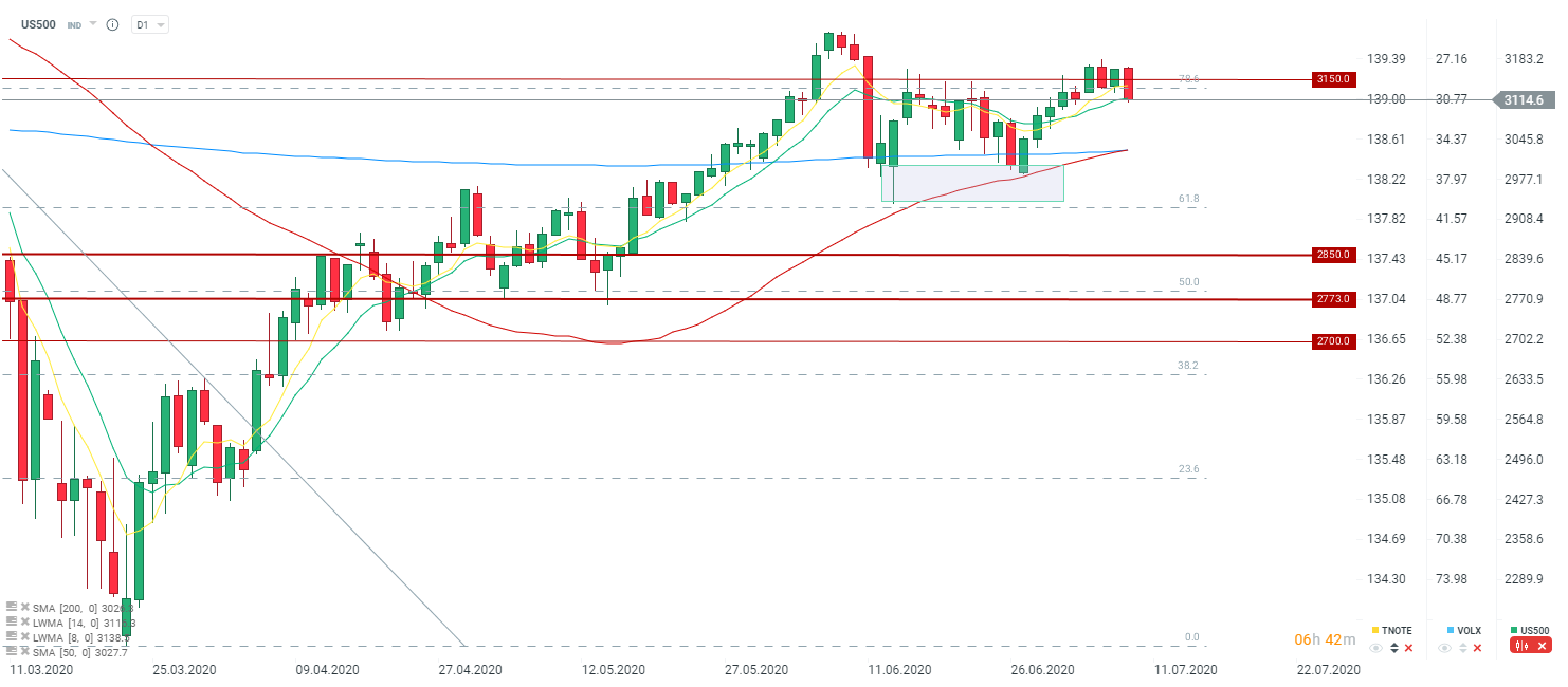 Wyraźne cofnięcie na Wall Street. Ostatnio tak silne spadki notowane były 26 czerwca. S&P 500 znajduje się już poniżej 8 oraz 14 okresowej średniej. Jeśli dzisiejsza sesja zakończy się podobnymi poziomami, możemy mieć do czynienia z objęciem bessy. Z drugiej strony średnia 50 okresowa przymierza się do przecięcia od dołu 200 okresowej, co raczej powinno być traktowane jako wejście rynku w okres hossy. Źródło: xStation5
